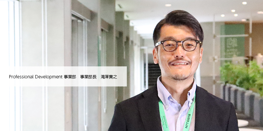 Professional Development事業部は、NTTデータグループ全体の高度専門性人材育成ニーズに対応するための人材育成プログラムの企画・開発と提供、およびNTTデータグループにおける人事制度改革施策の実行を担う事業部です。AI・システム開発からビジネススキルまで幅広い分野の研修提供と、NTTデータの重点HR施策の実行を主な事業の柱としています。